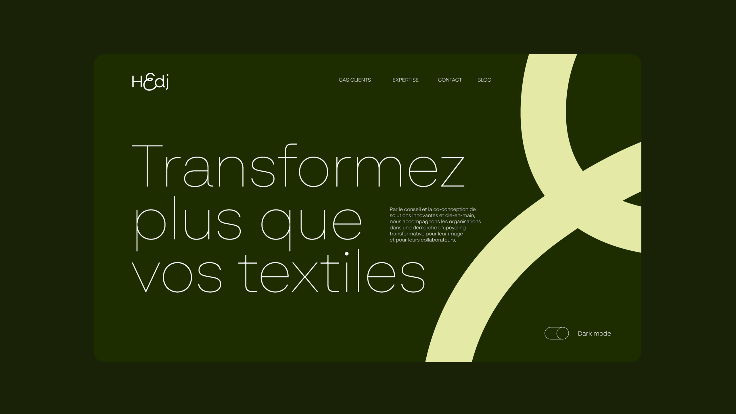 Pour opérer cette bascule et refondre intégralement son branding, l’entreprise s’est appuyée sur VUPAR. Un nouveau naming : adieu Second Sew, jugé trop complexe et peu mémorisable. Place à Hedj, un nom court, impactant et taillé pour le BtoB. La création d’un plateforme de marque : définition d’un territoire clair et inspirant pour structurer le nouveau discours. Une nouvelle identité visuelle : création d’un univers graphique distinctif et crédible pour asseoir son expertise sur le marché professionnel. En clarifiant le message et en assurant la cohérence de l’image, VUPAR a donné à Hedj les armes pour s’imposer dans l’univers de l’upcycling textile professionnel.